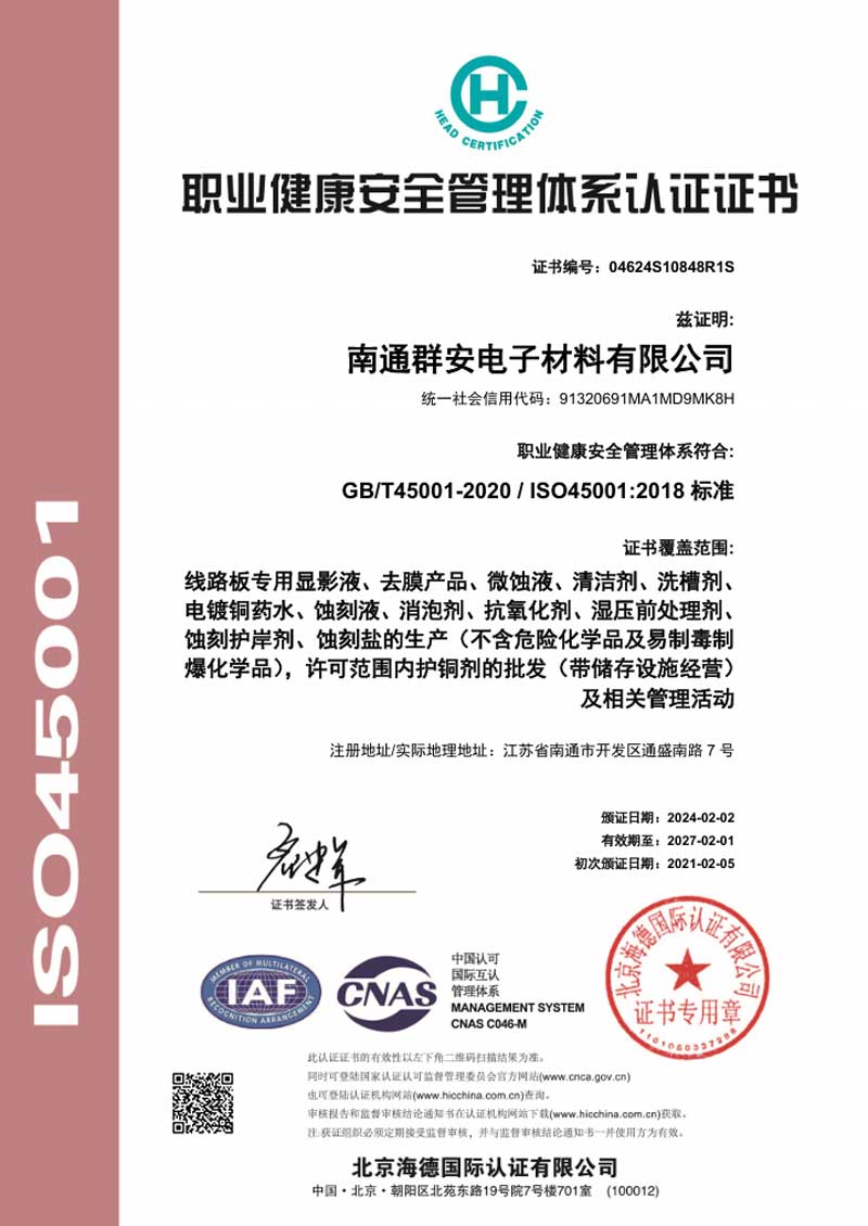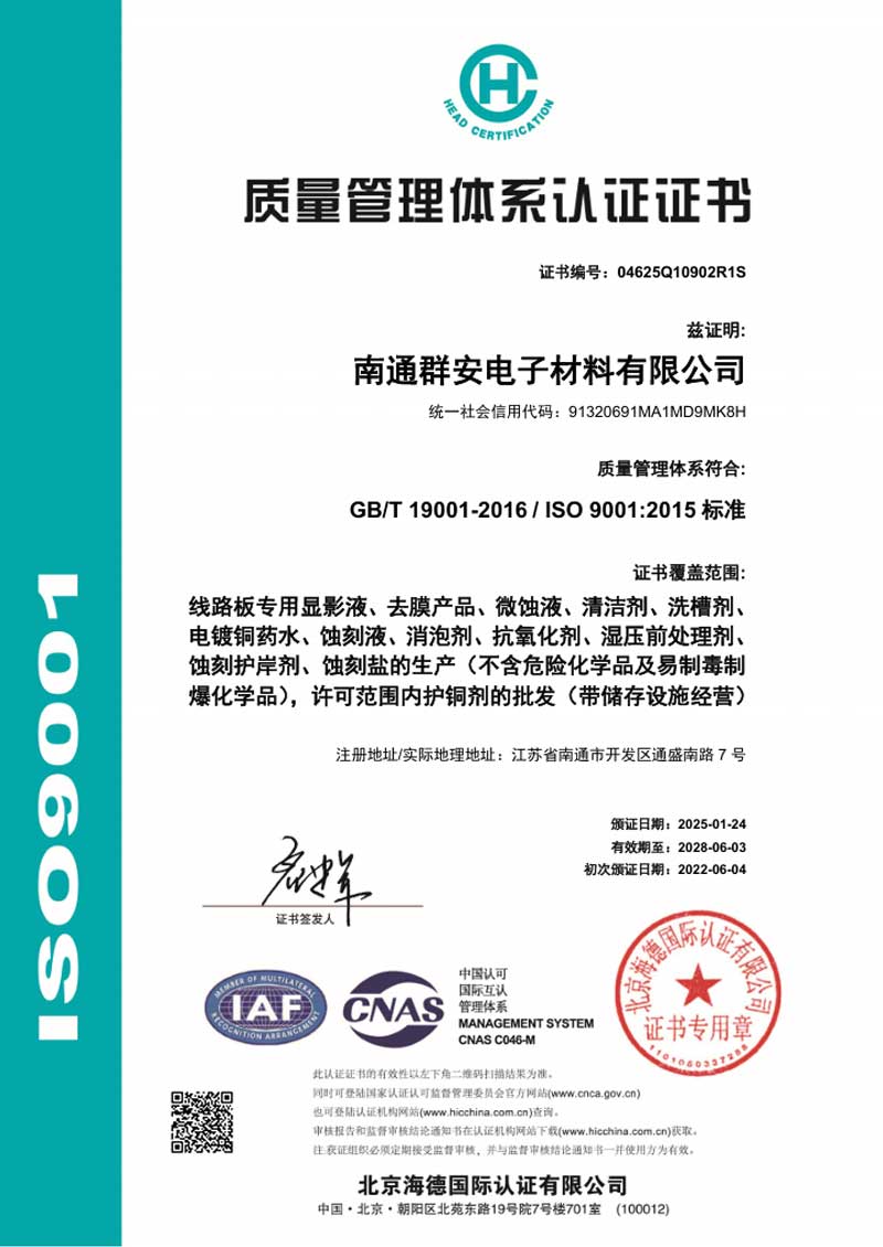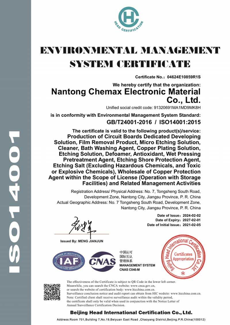 Nantong Chemax Electronic Materials Co., LTD., as an electronic chemicals supplier, has been engaged in formula research and development, production and sales of chemical solutions for various PCB processes (including micro-etching, film removal, cleaning, etc.) since 2006, and provides customers with comprehensive and considerate services. The company is located in the Chemical Industry Park of Nantong Development Zone, covering an area of 30 mu, with a total construction area of approximately 12,000 square meters and an annual production capacity of 20,000 tons.